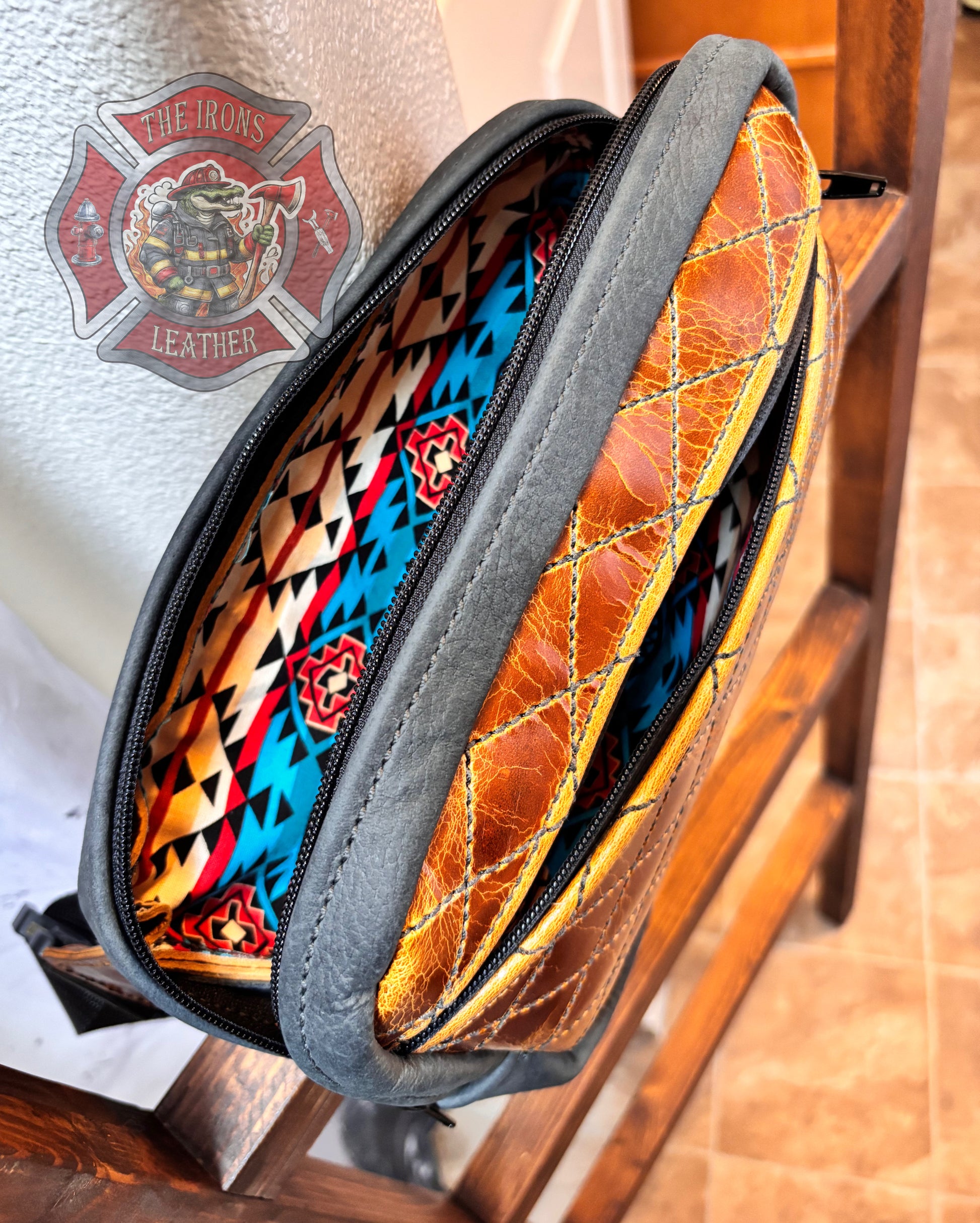 This 2-compartment cross body bag comes in at 7in by 11in and a cobra buckle for quick release standard bag does not have decorative stitching. Can be lined with whatever fabric you choose.